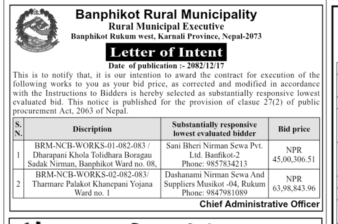आशयको सूचना प्रकाशन मिति २०८२।१२।१७। गोरखापत्र दैनिक । BRM-NCB-WORKS-02-082-083, Tharmare palakot Khanepani yojana ward no 1 र BRM-NCB-WORKS-01-082-083 / Dharapani Khola Tolidhara Boragau Sadak nirman, Banphikot Ward no. 08,